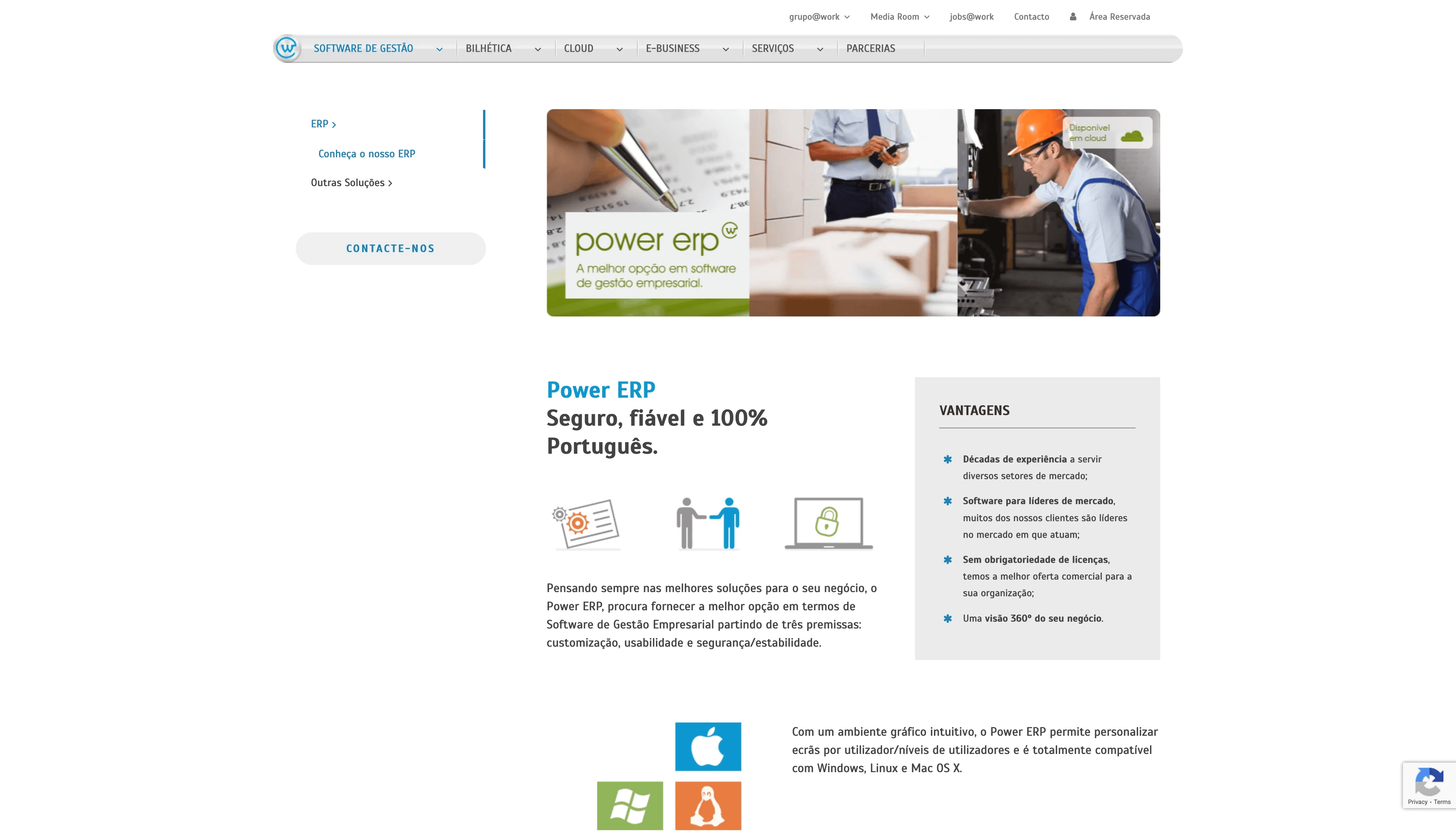Corporate website for grupo@work, showcasing their technology solutions across software management, mobility, cloud services, e-business, and partnerships. The site acts as both a brand presence and a lead-generation platform.
